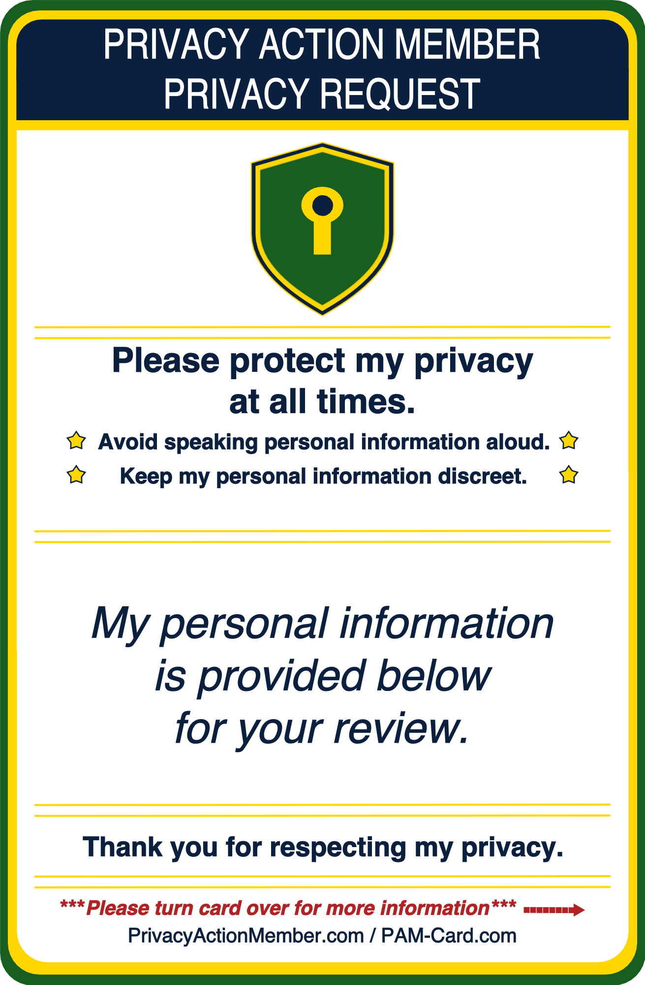 Hand the card to the person assisting you before responding to questions that may require personal details. The card’s wording communicates a clear preference for discretion in a professional, non-confrontational way.